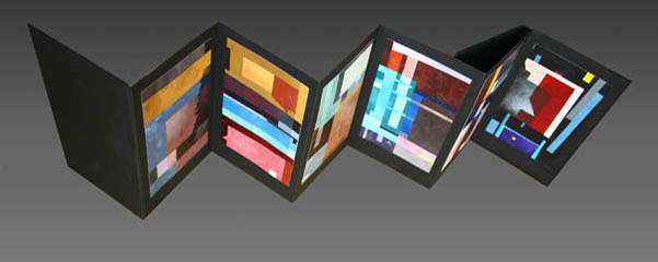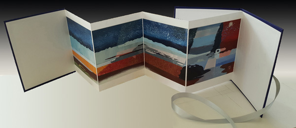 Concertina Books with original works of art represent a personal gallery that is either on display or stored as a book. It is the original paintings that make this a worthy investment for personal use or as a gift These books are bound in tissue-lined bookcloth. Some books have an additional leather spine and some include a slipcase. When not displayed as an exhibit (see images below), the books are kept closed by a ribbon tied around the book with a tab at the end – similar to a belt - or simply tied in the form of a shoelace-style knot. All artwork carried out in acrylic paint on prepared 120 gsm acid-free cartridge paper. Please click on images below for a detail view.